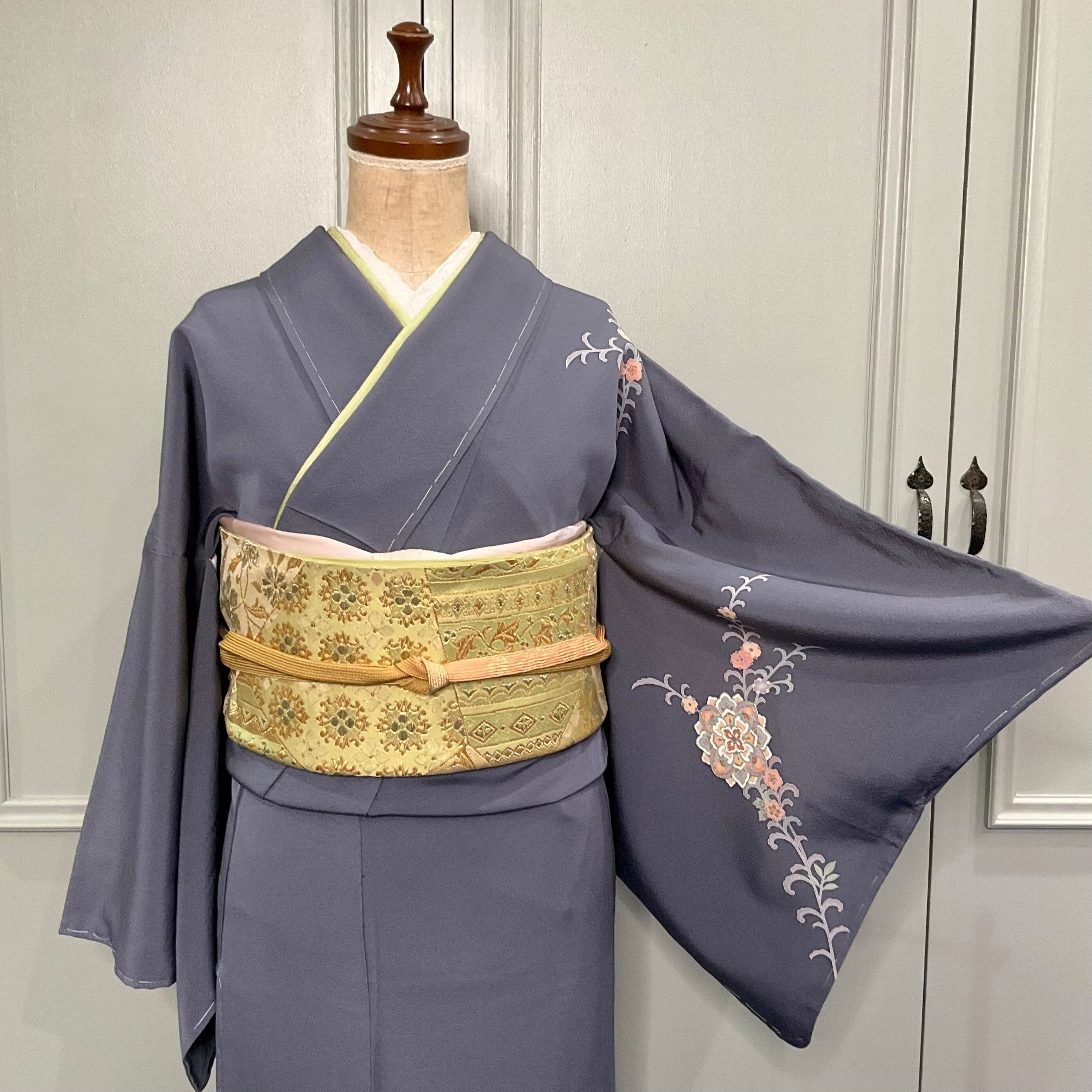 訪問着は、グレー系の地色に優美な曲線を描く花唐草文がモダンで気品ある訪問着です