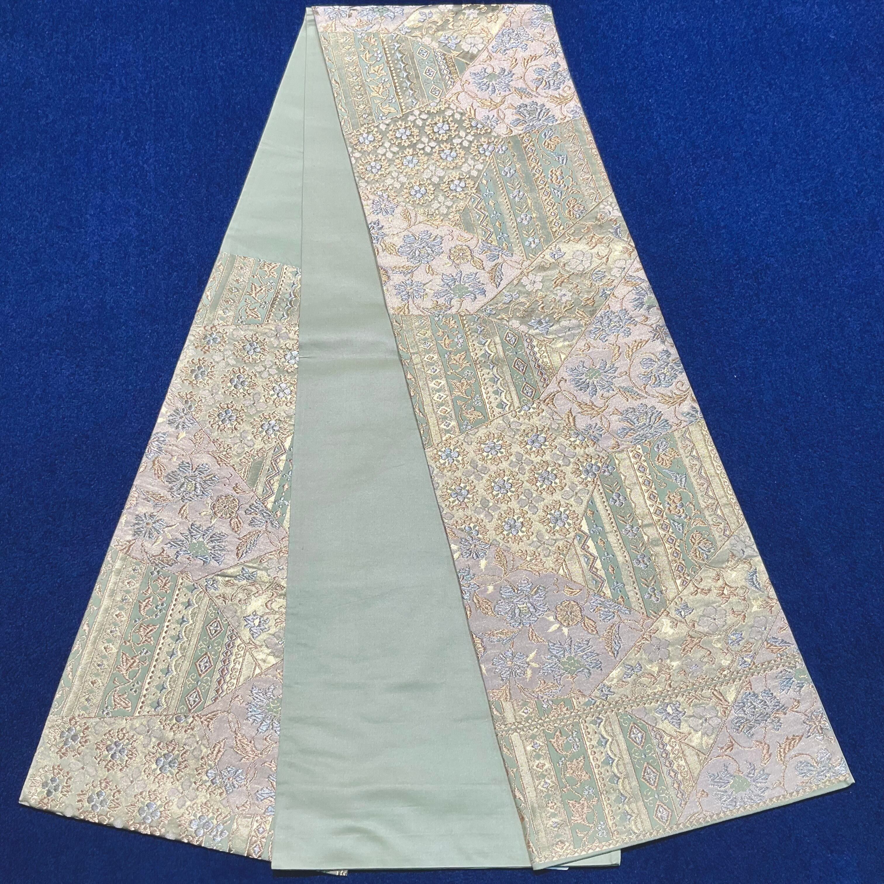 淡いアップルグリーンの地色に細やかな織で彩られた花模様は大変華やかで、奥行きを感じる帯姿
