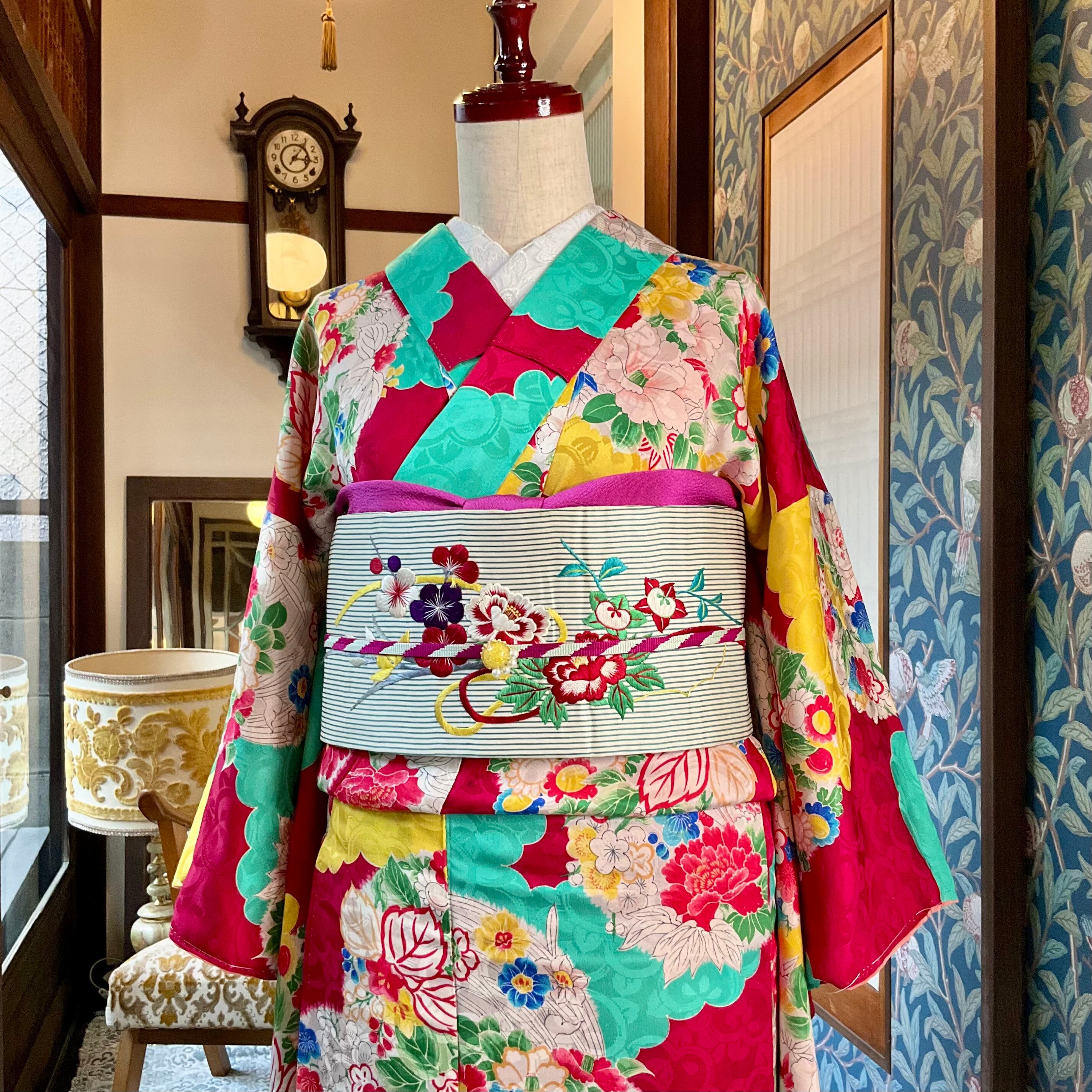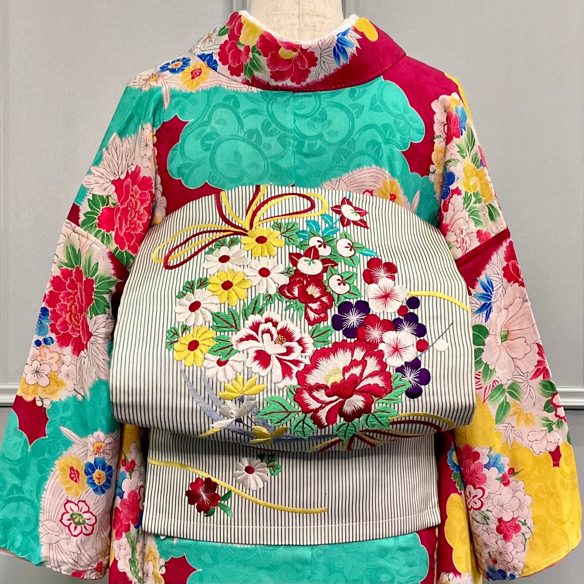 豪華な刺繍帯なので、普通の小紋だけでなく、アンティークの訪問着や付下げ着物をカジュアルダウンさせて着たいときに、合わせるのも素敵ですよ♩