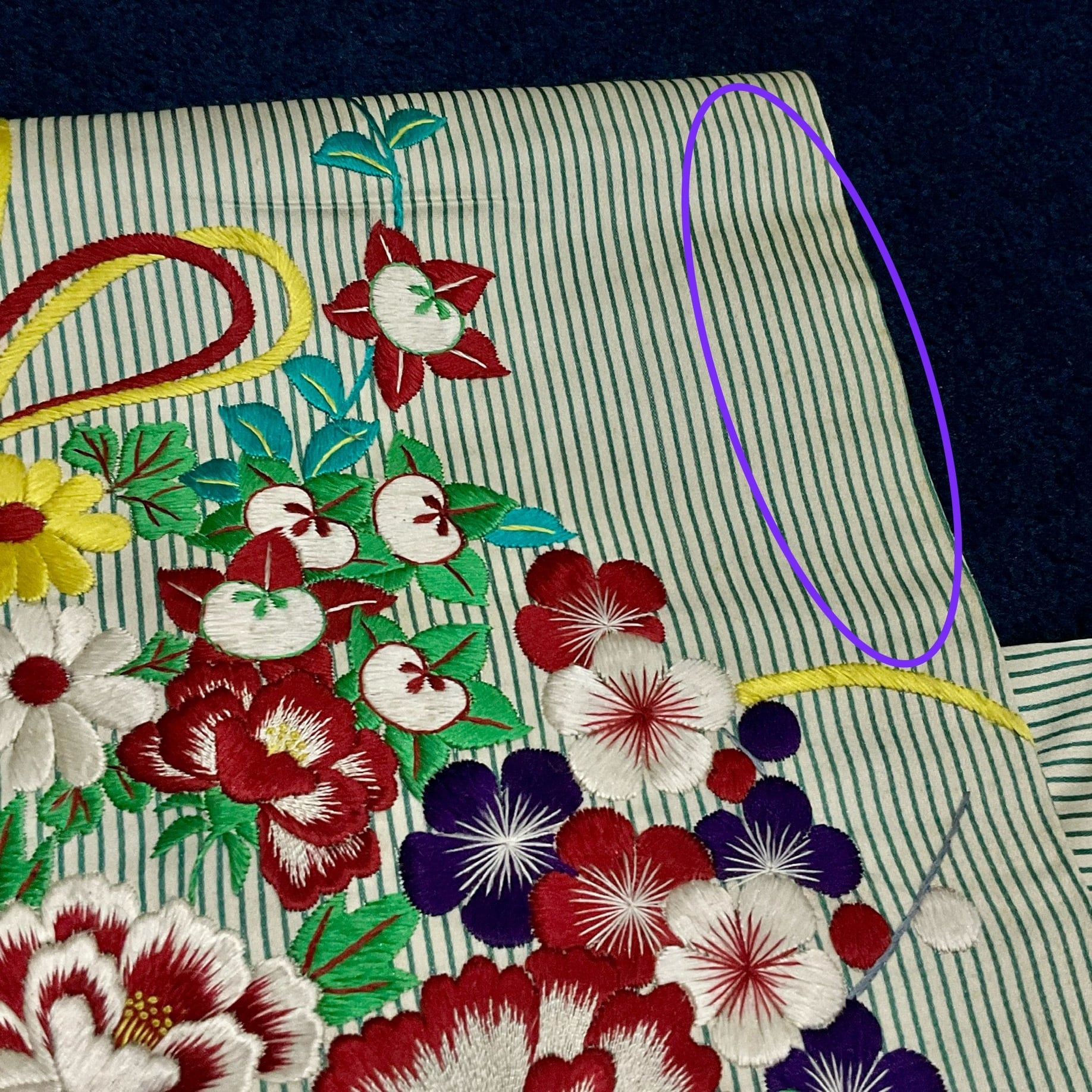 お太鼓、胴前の刺繍糸の毛羽立ち。