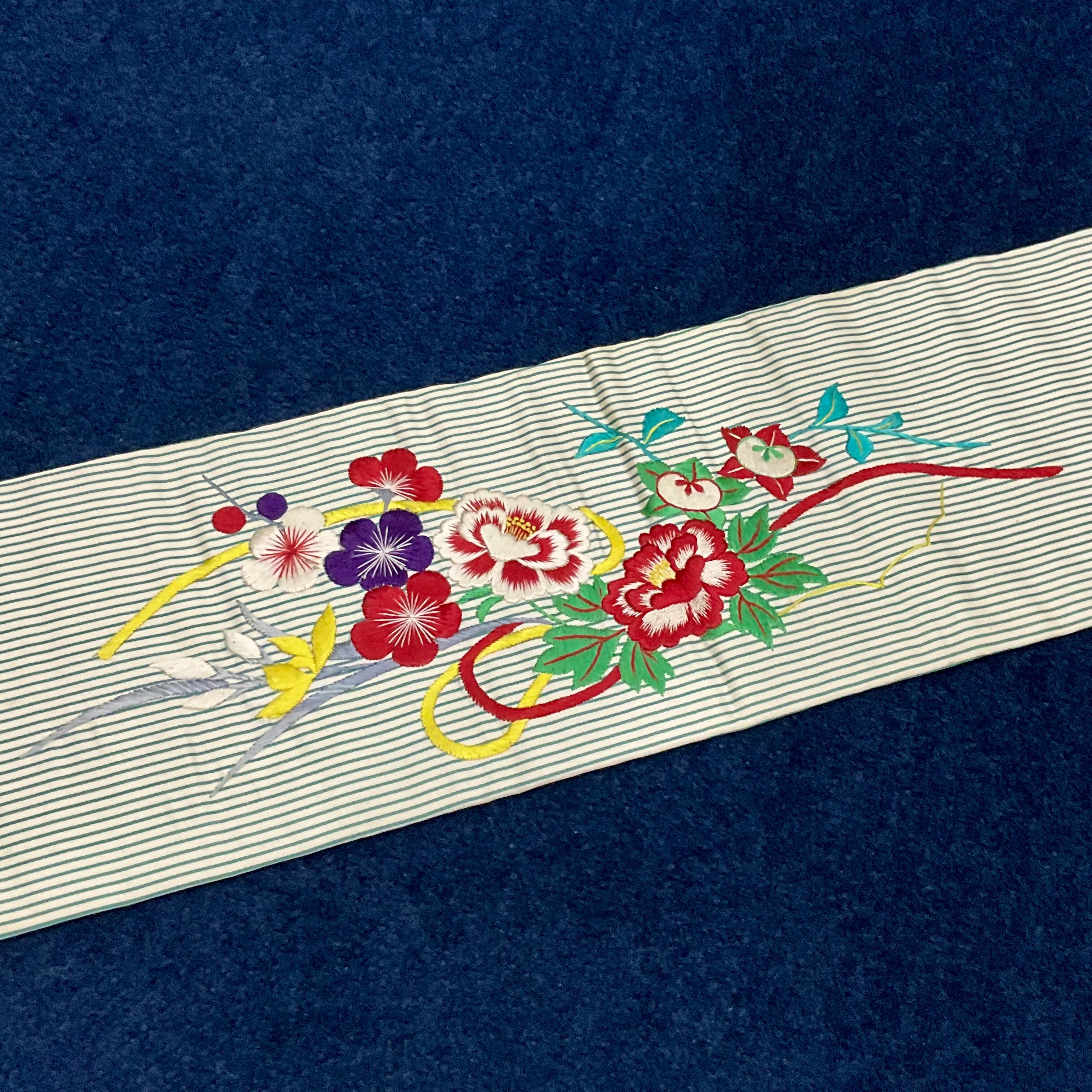 グリーン×白のストライプの繻子地に、大きな花薬玉が刺繍されたアンティーク名古屋帯です