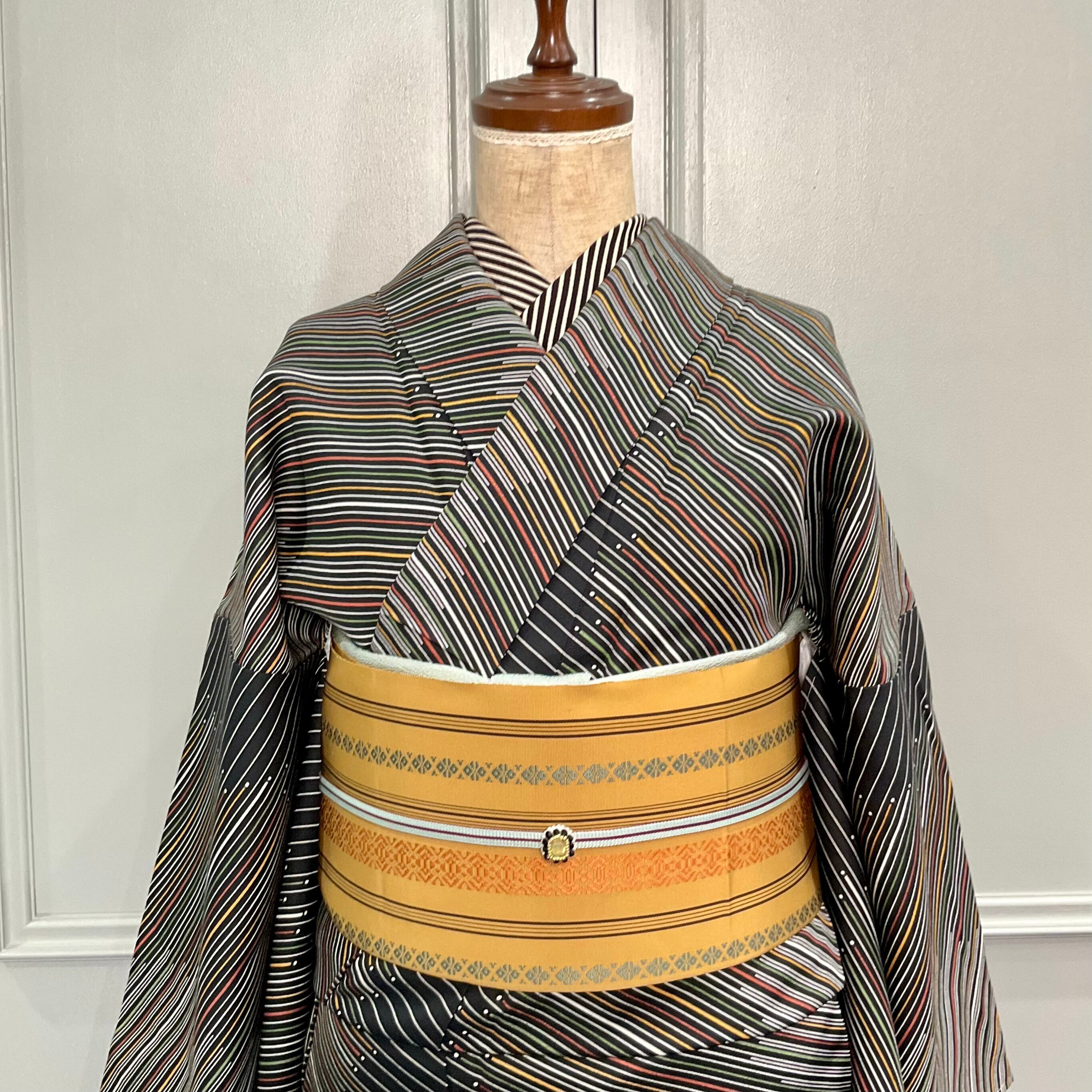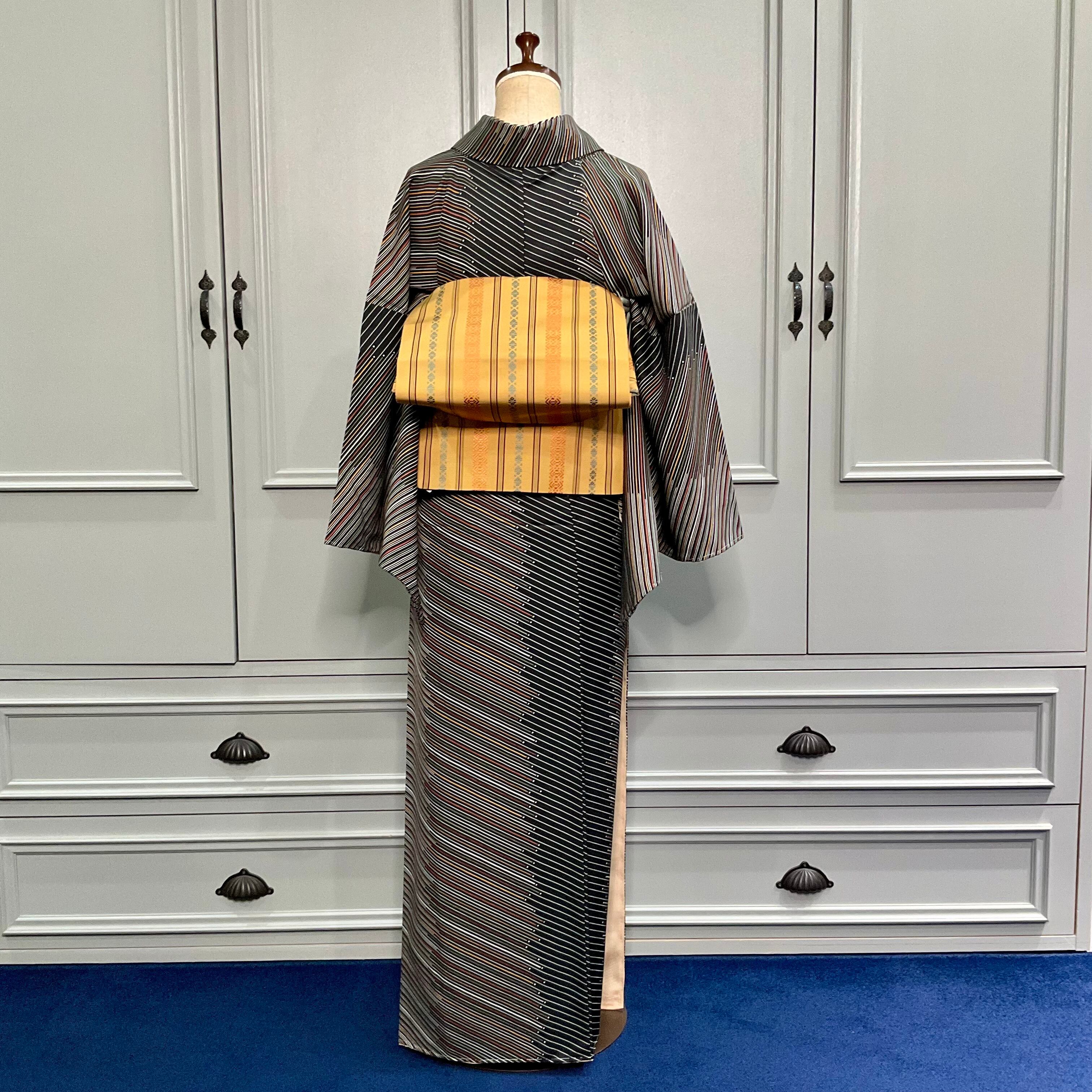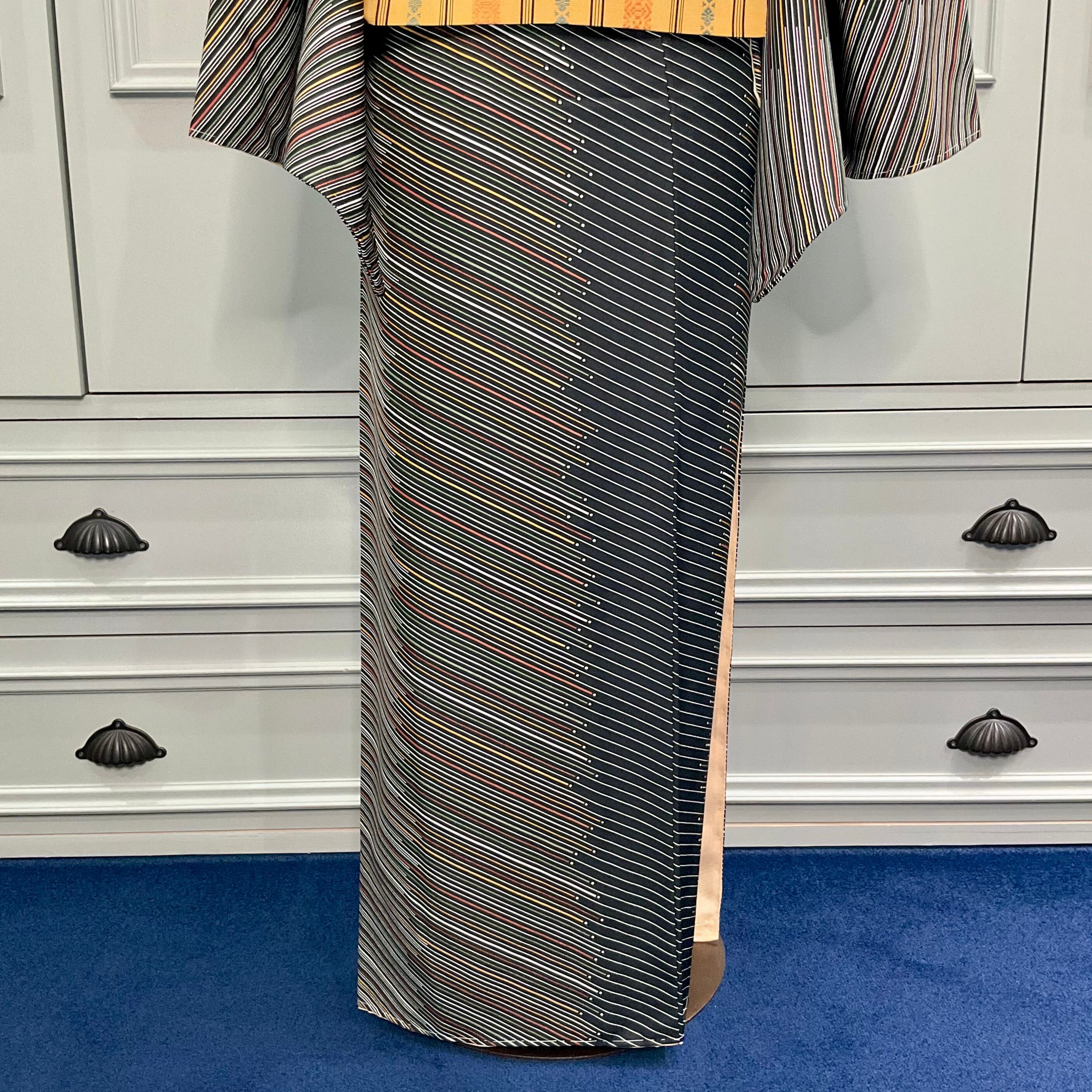 long*縞と点*未使用品 ブラック 斜め縞 小紋着物 A939