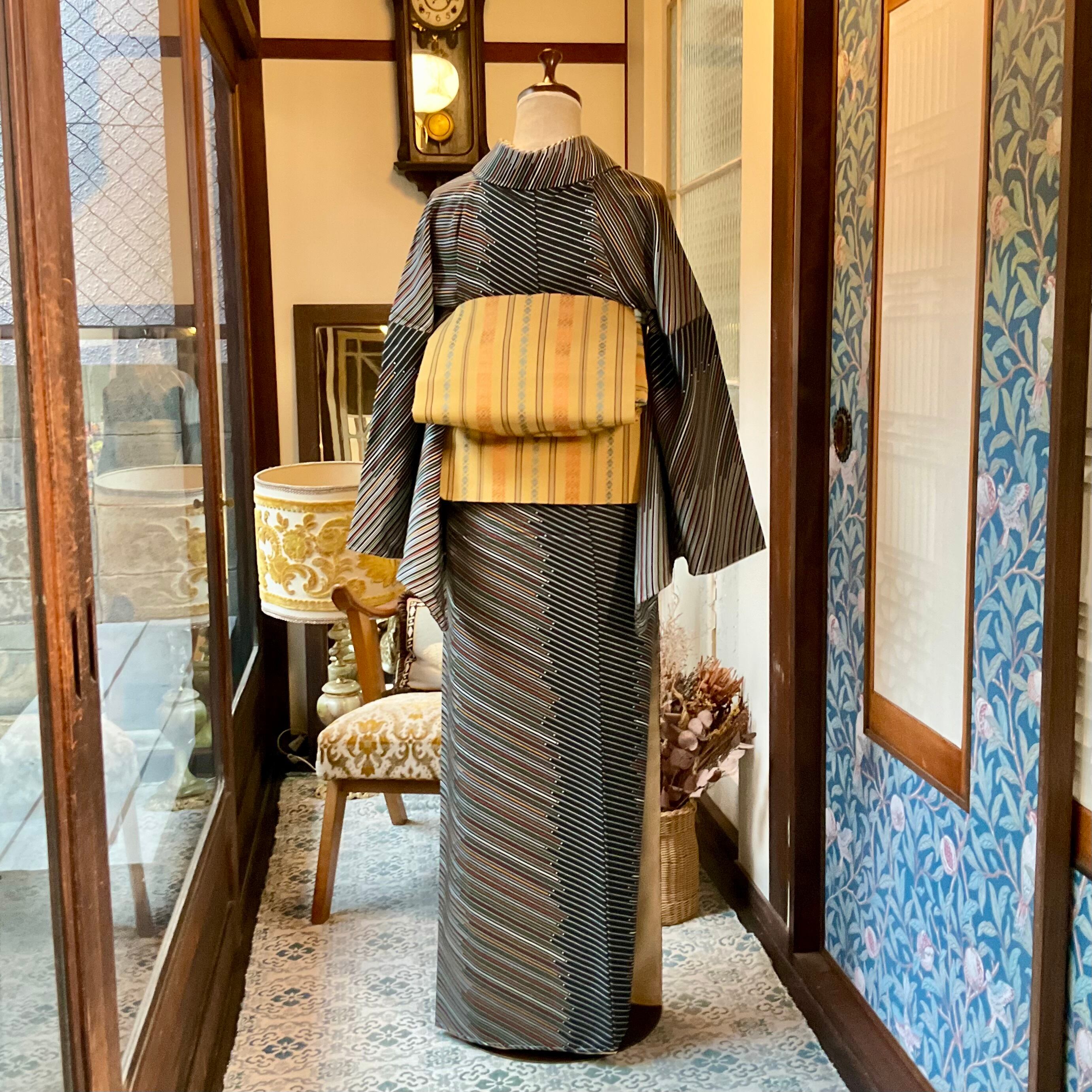 ブラックの地色にホワイトの斜め縞模様がスタイリッシュな小紋です。