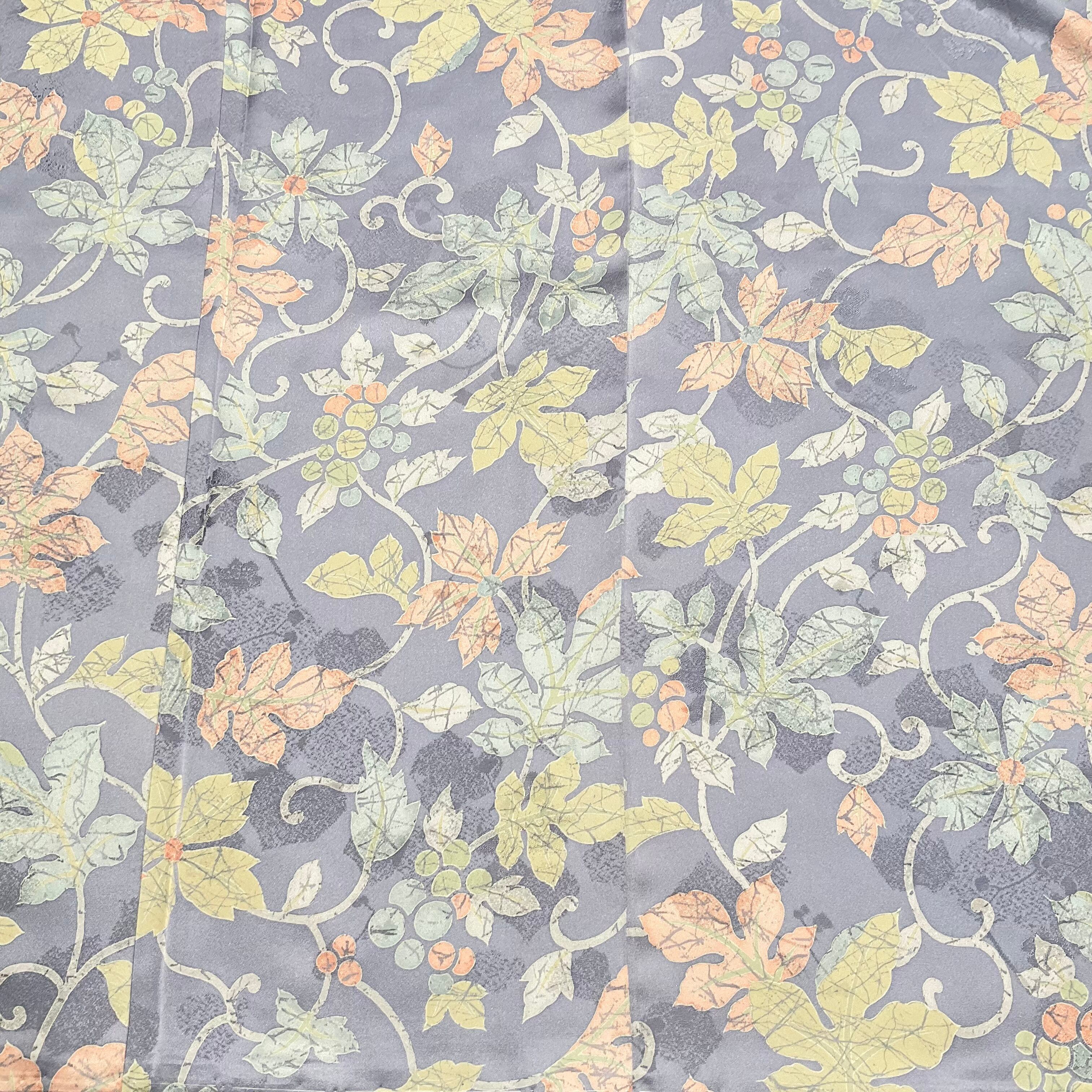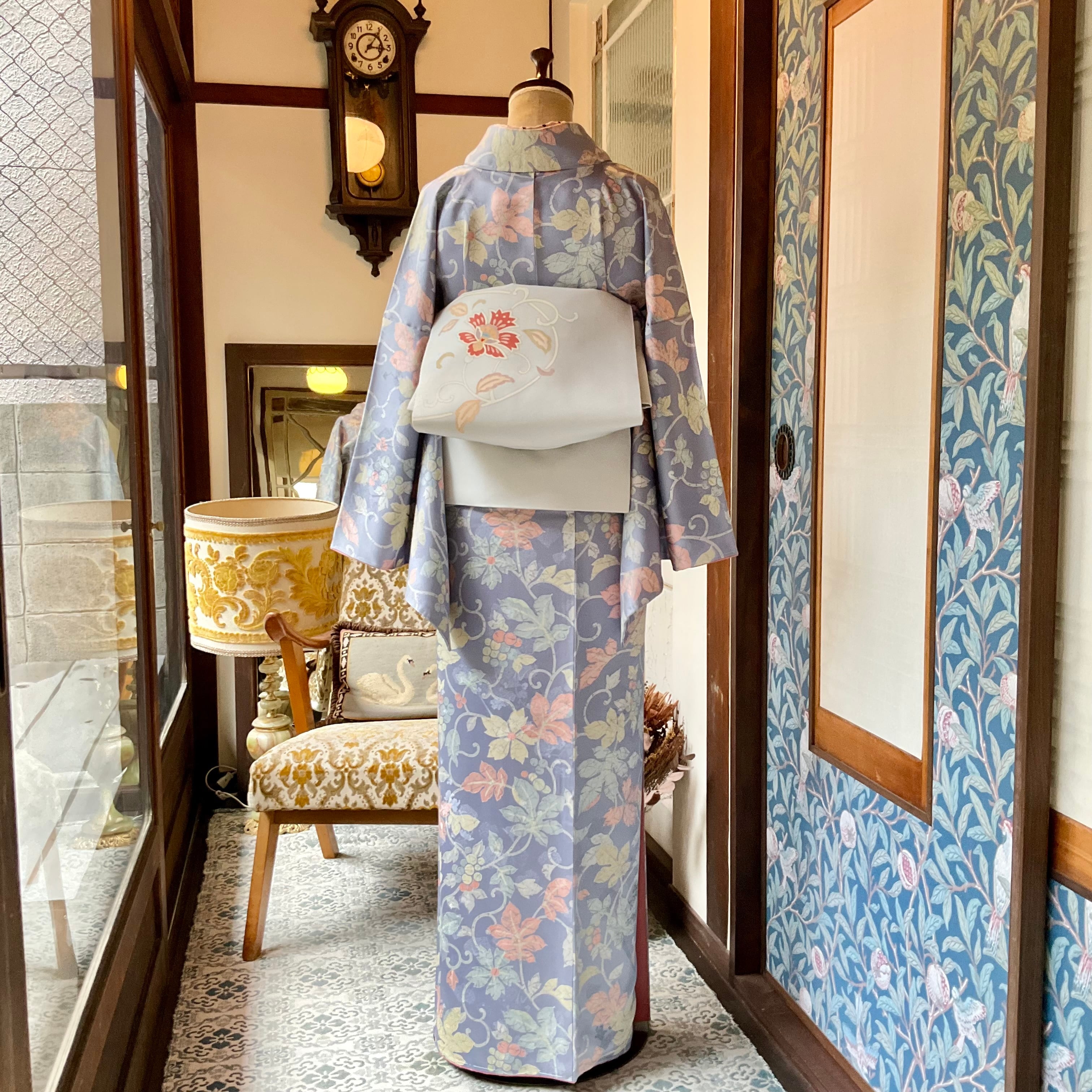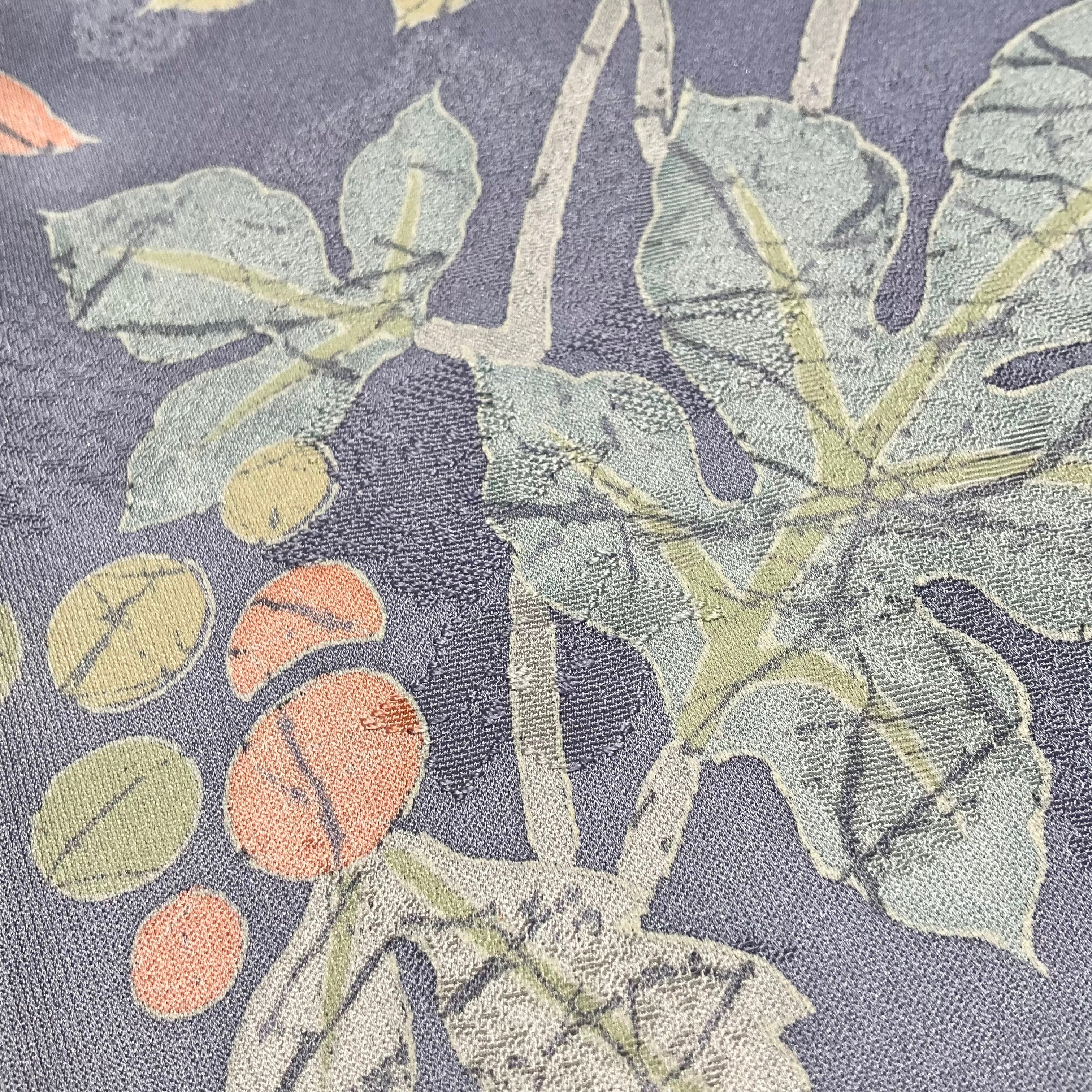 ブルーラベンダーの地色に、やさしくボタニカルなぶどう唐草模様が素敵な小紋着物です♪