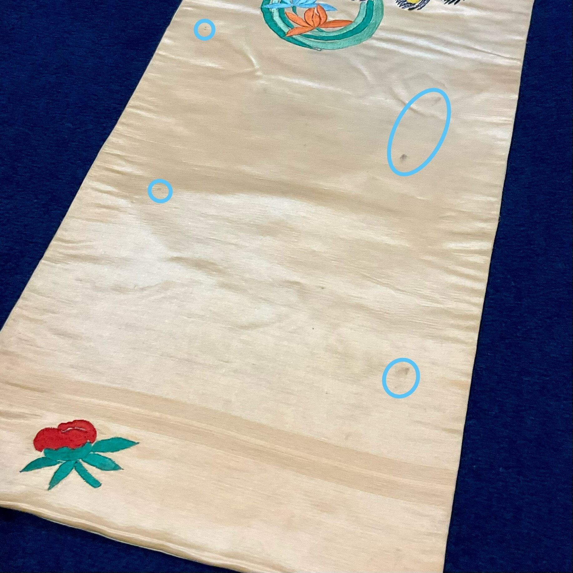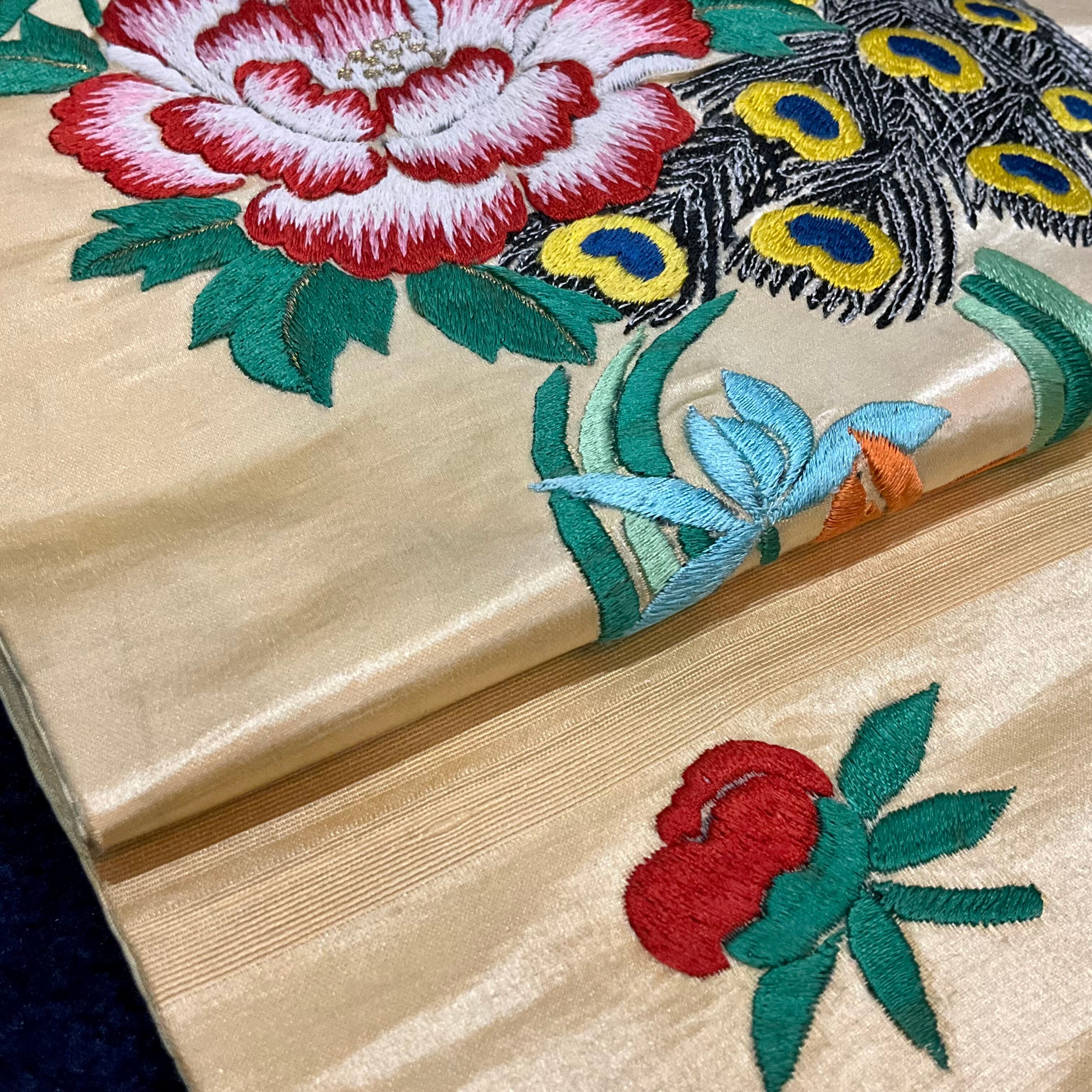 クリームイエローの繻子地に、レアな孔雀とお花が刺繍されたアンティーク名古屋帯です