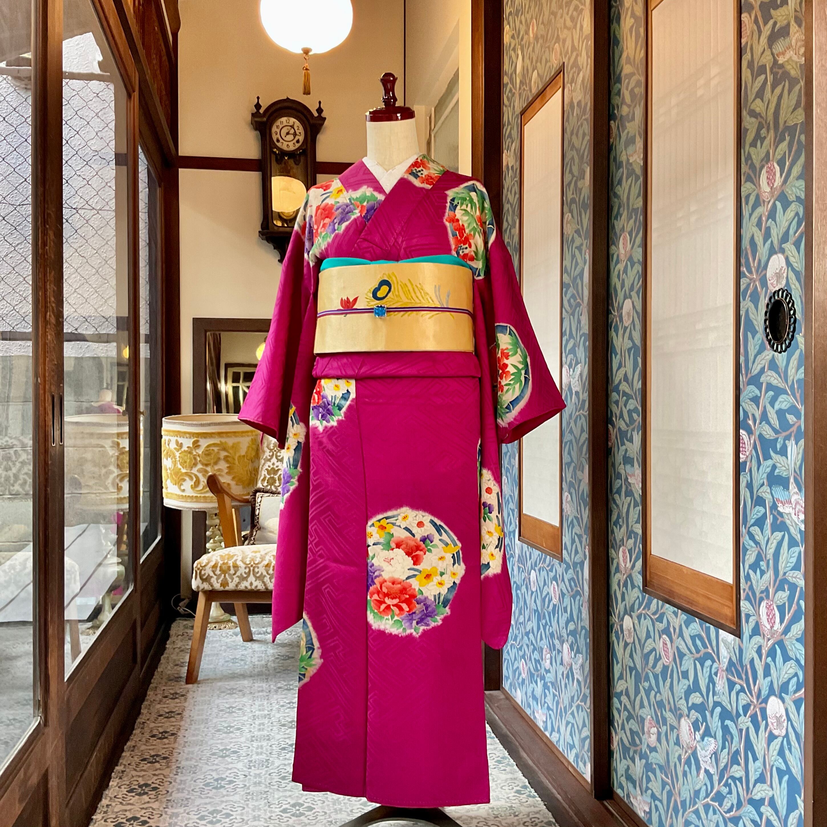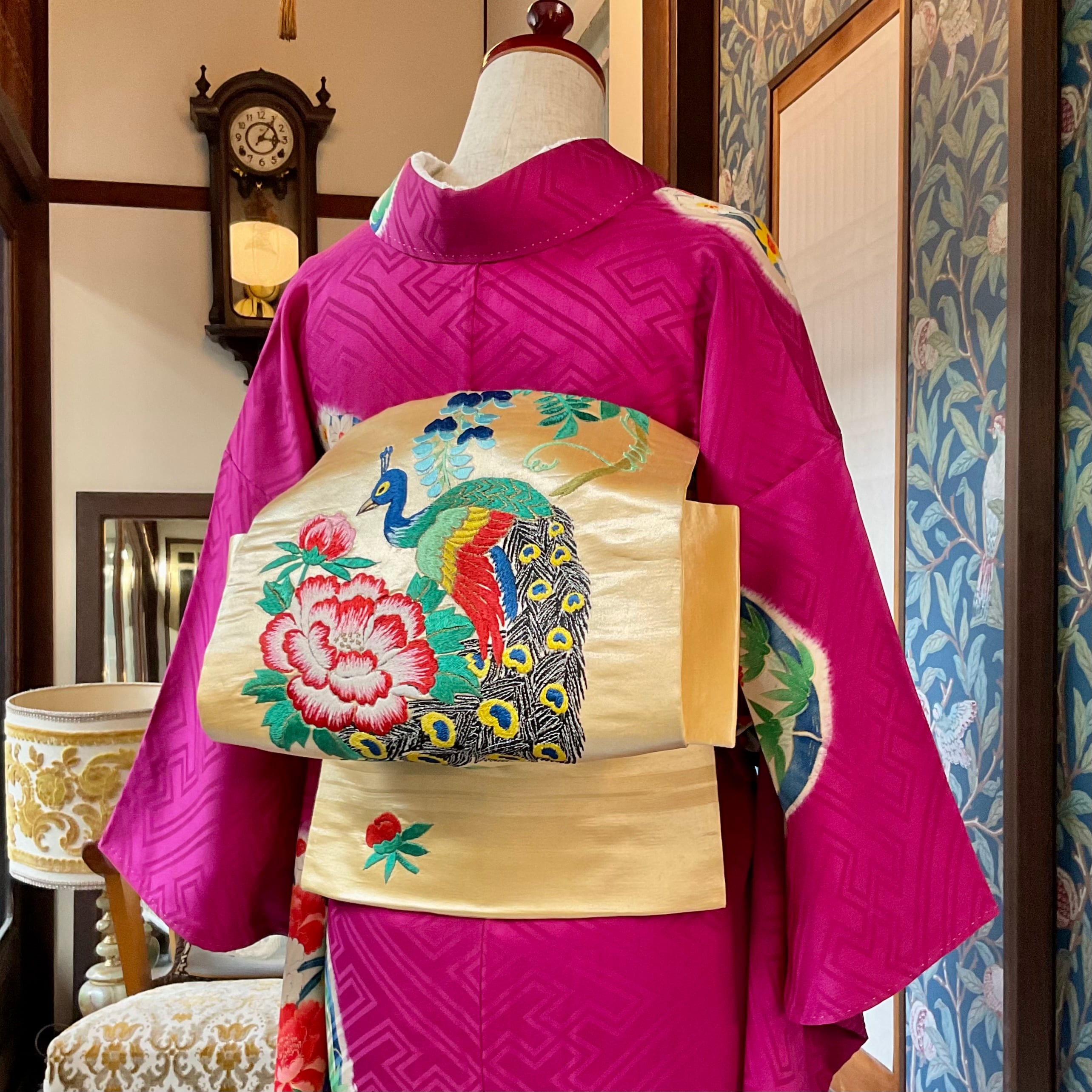豪華な刺繍帯なので、普通の小紋だけでなく、アンティークの訪問着や付下げ着物をカジュアルダウンさせて着たいときに、合わせるのも素敵ですよ♩