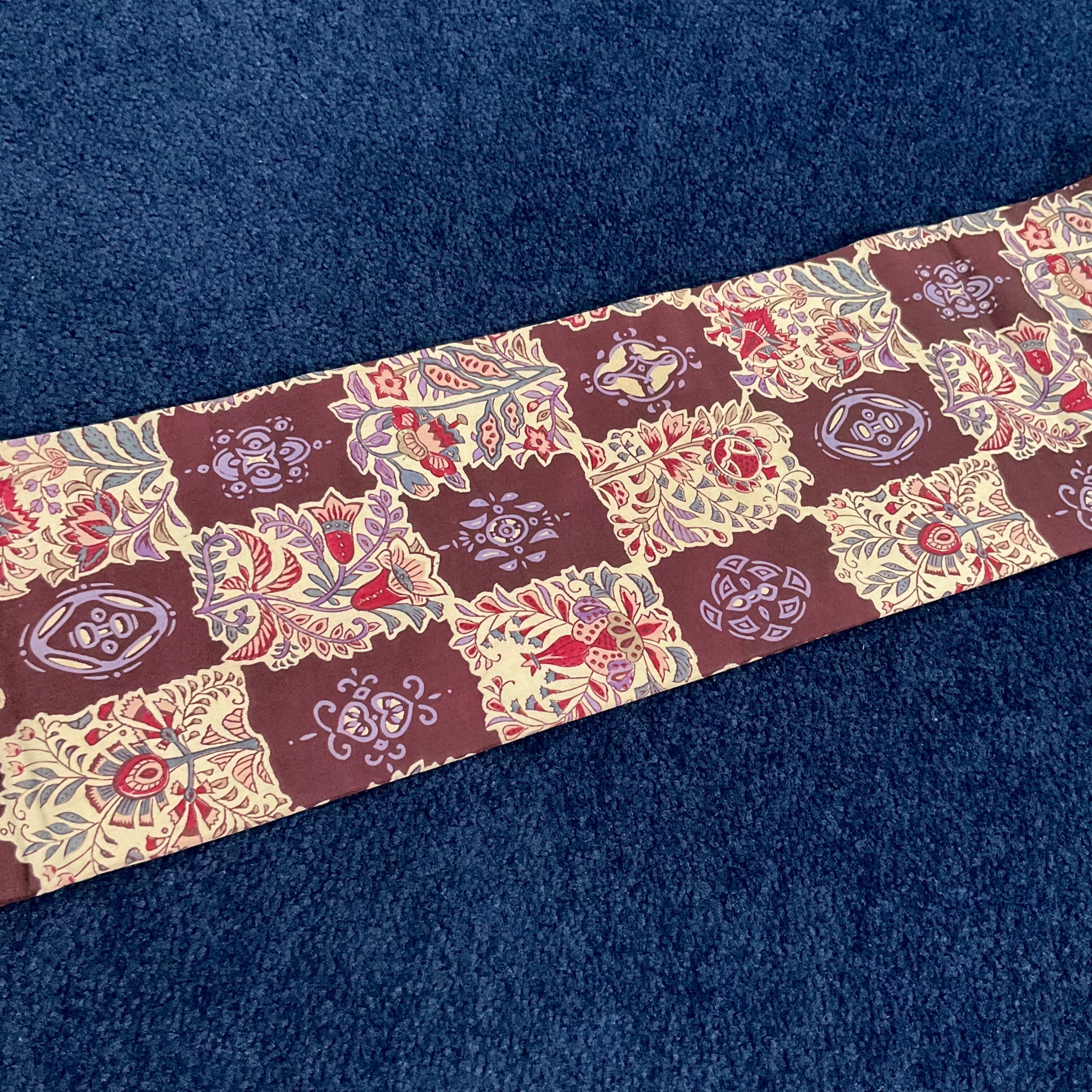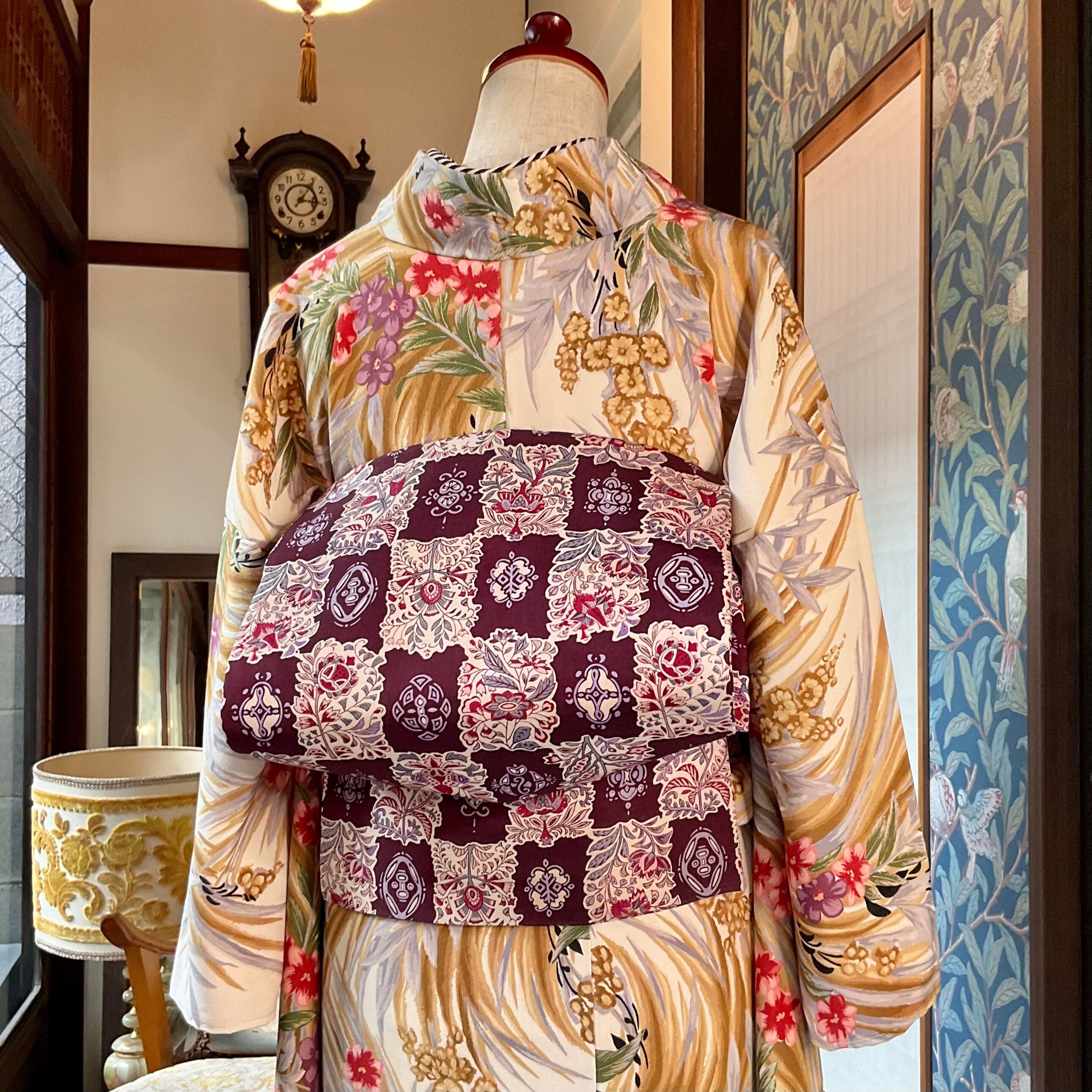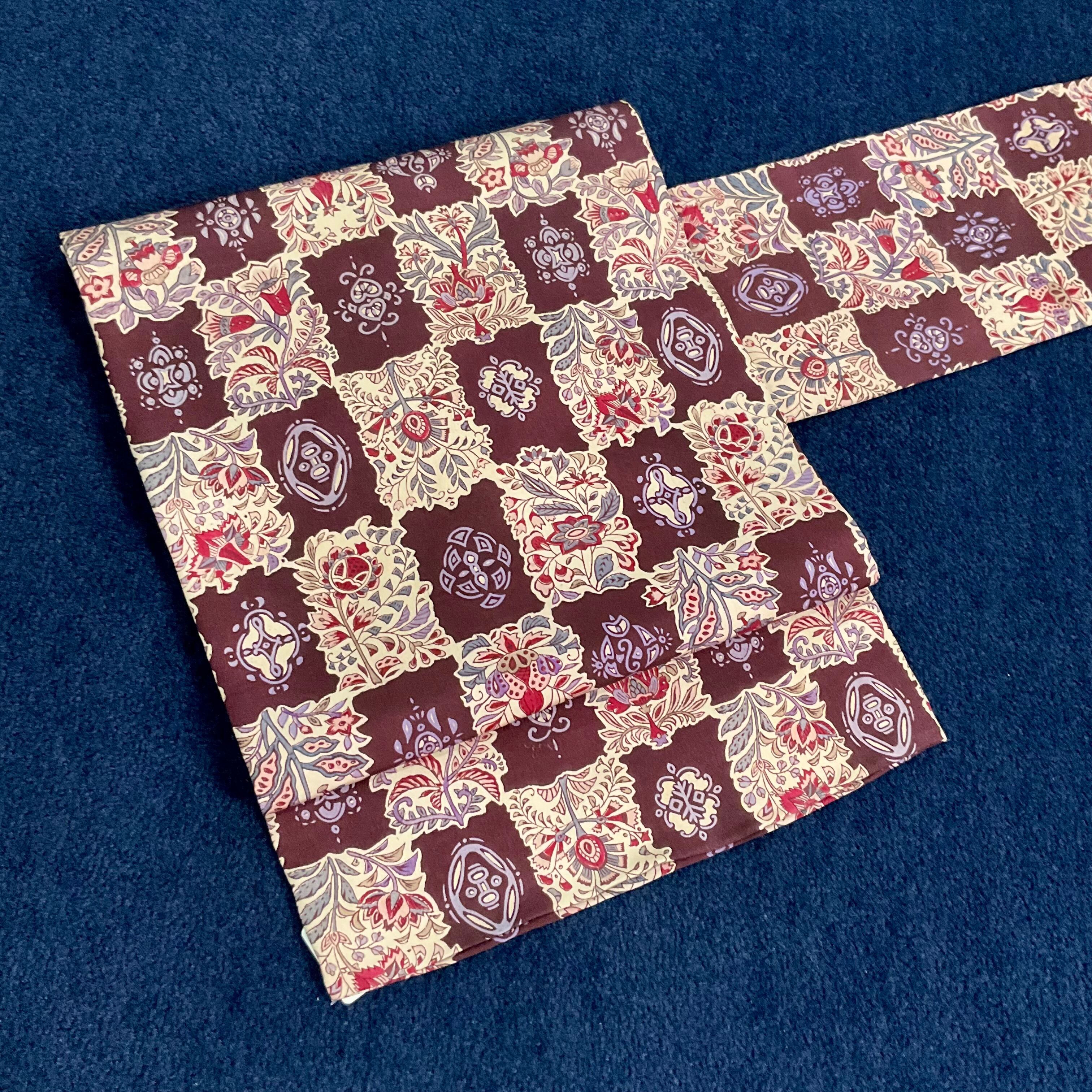 ダークブラウン系のブロックチェックの中に、ボタニカルな模様が描かれたアンティーク名古屋帯です