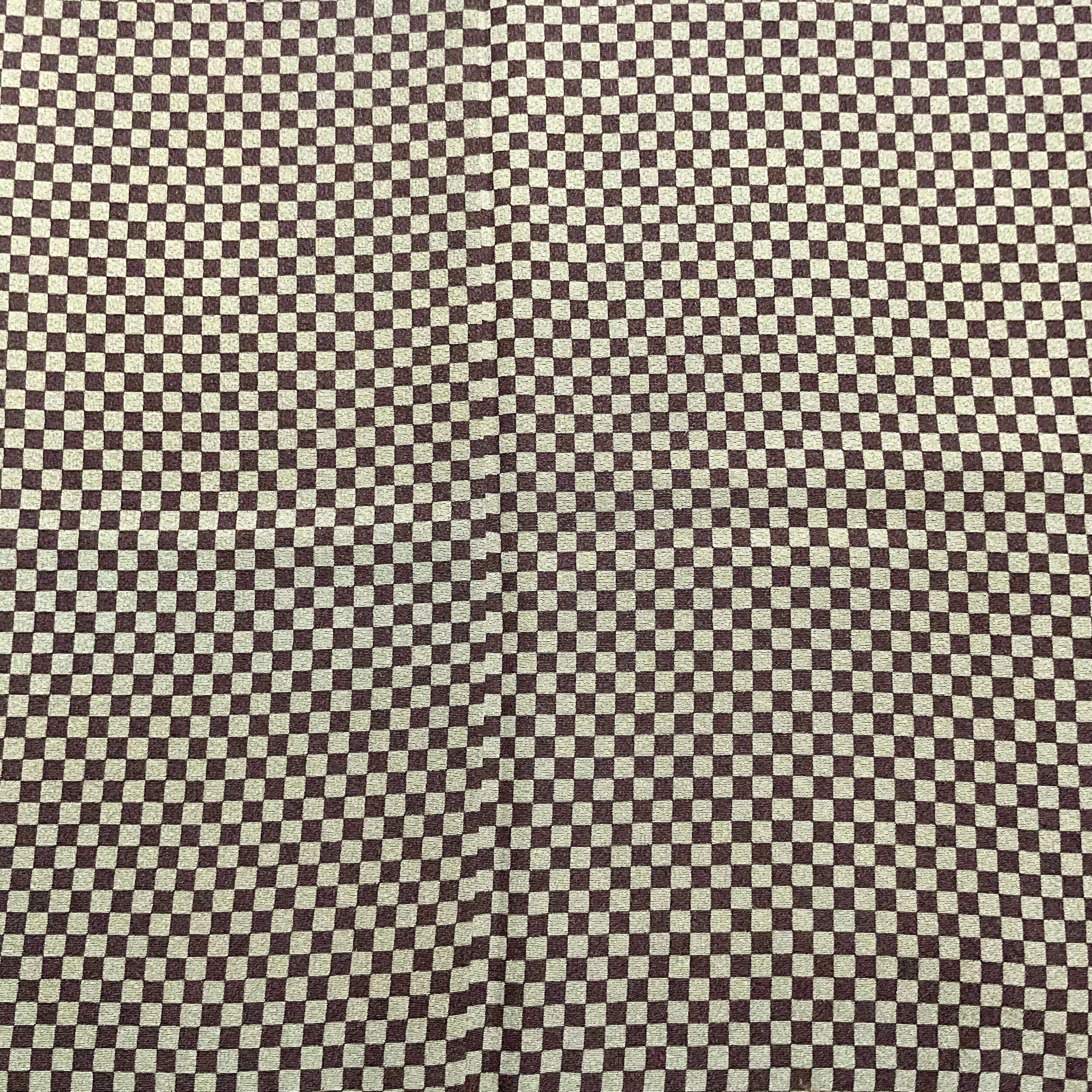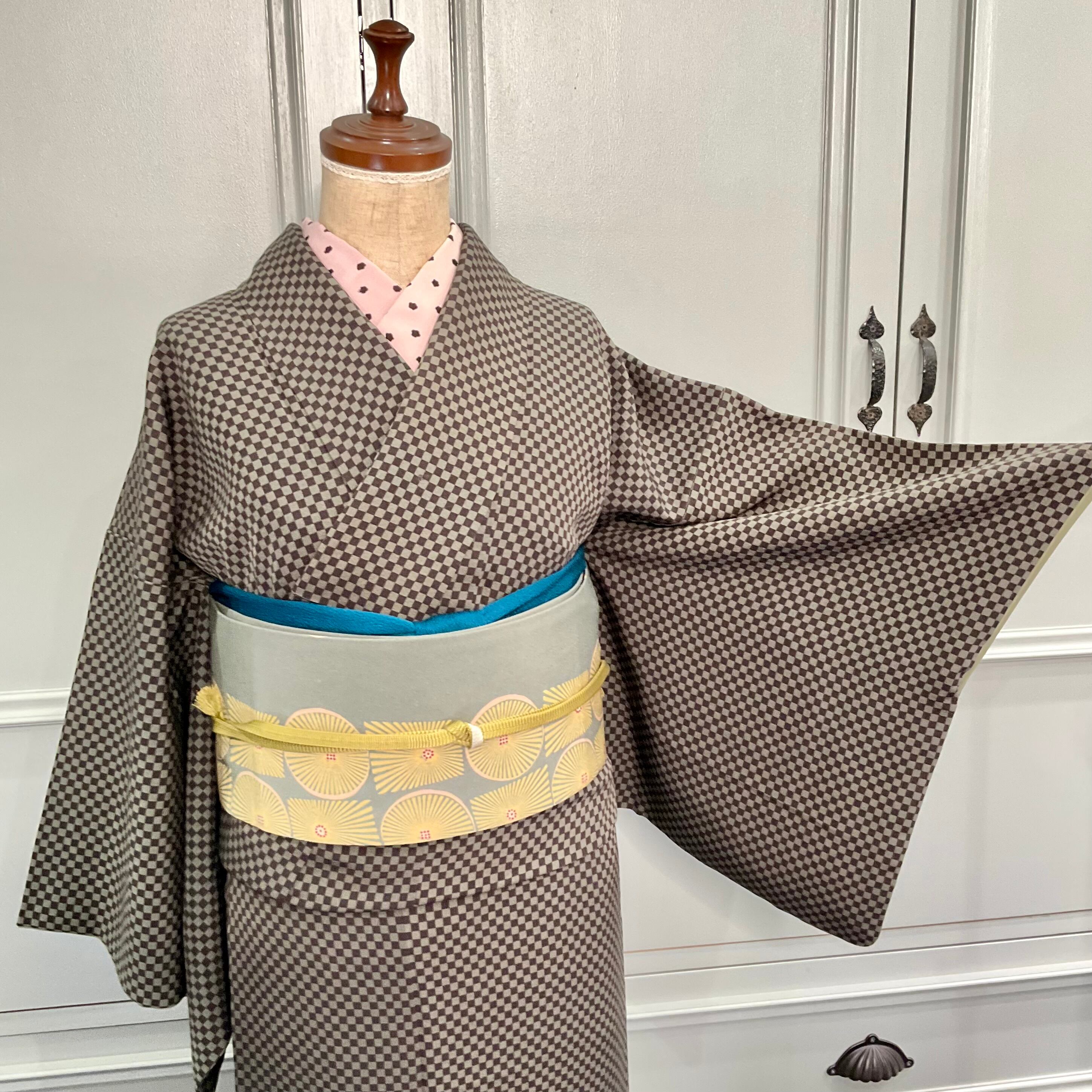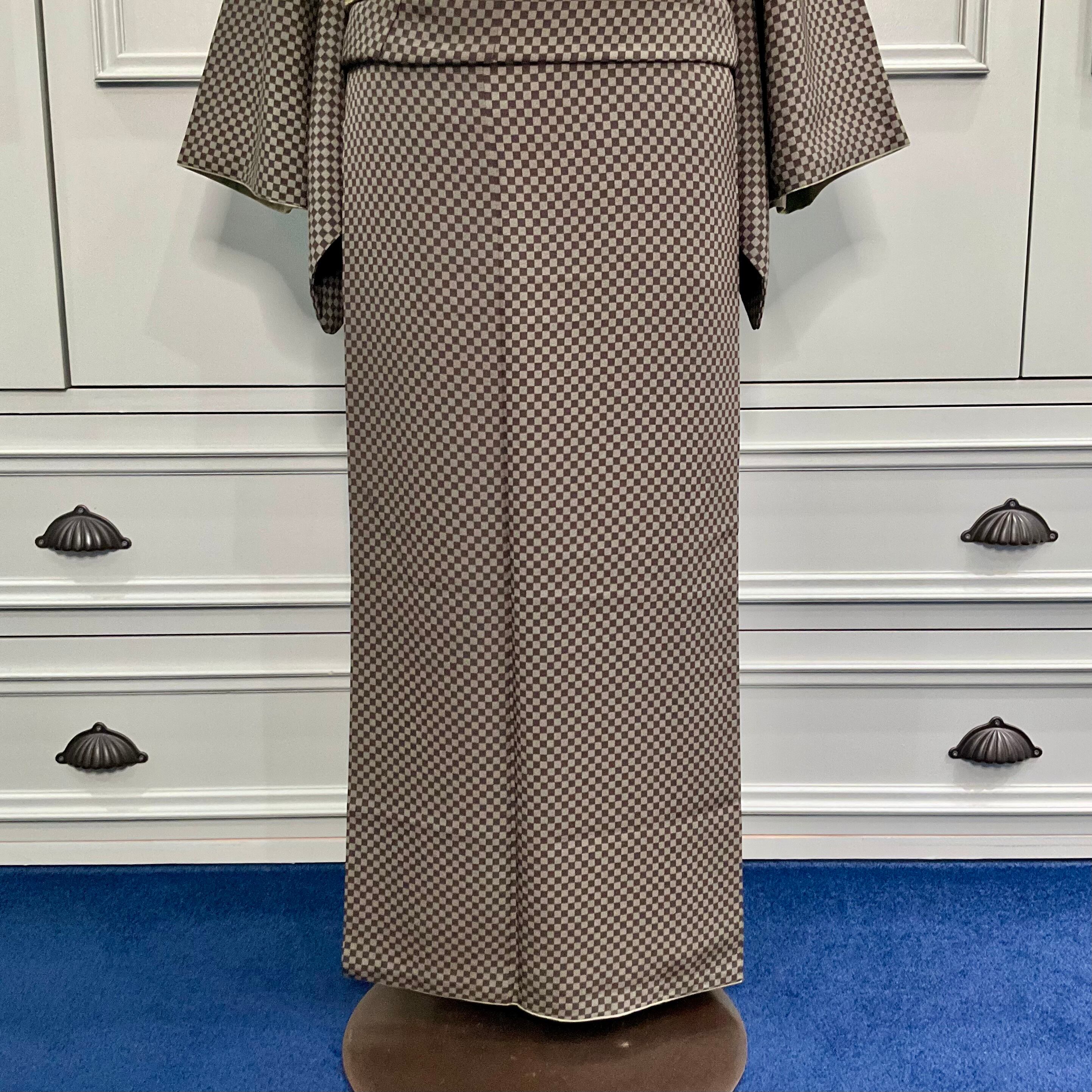 チョコレートのようなブラウン×オリーブの市松模様が洒落た小紋着物です
