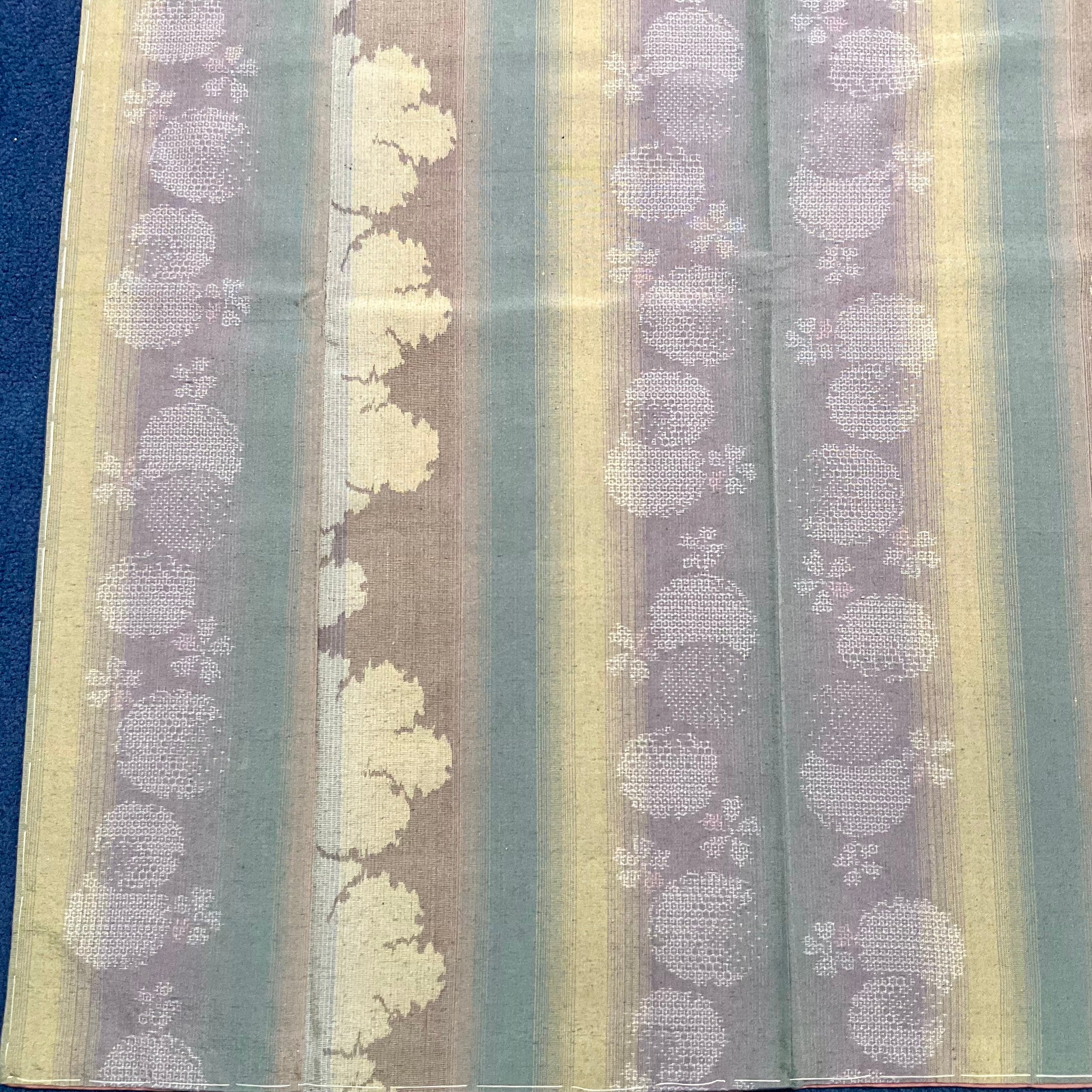 アースカラーのグリーン、パープル、マスタードといった落ち着いた色目が縦に彩られ、紬の上品さを引き立てていますね