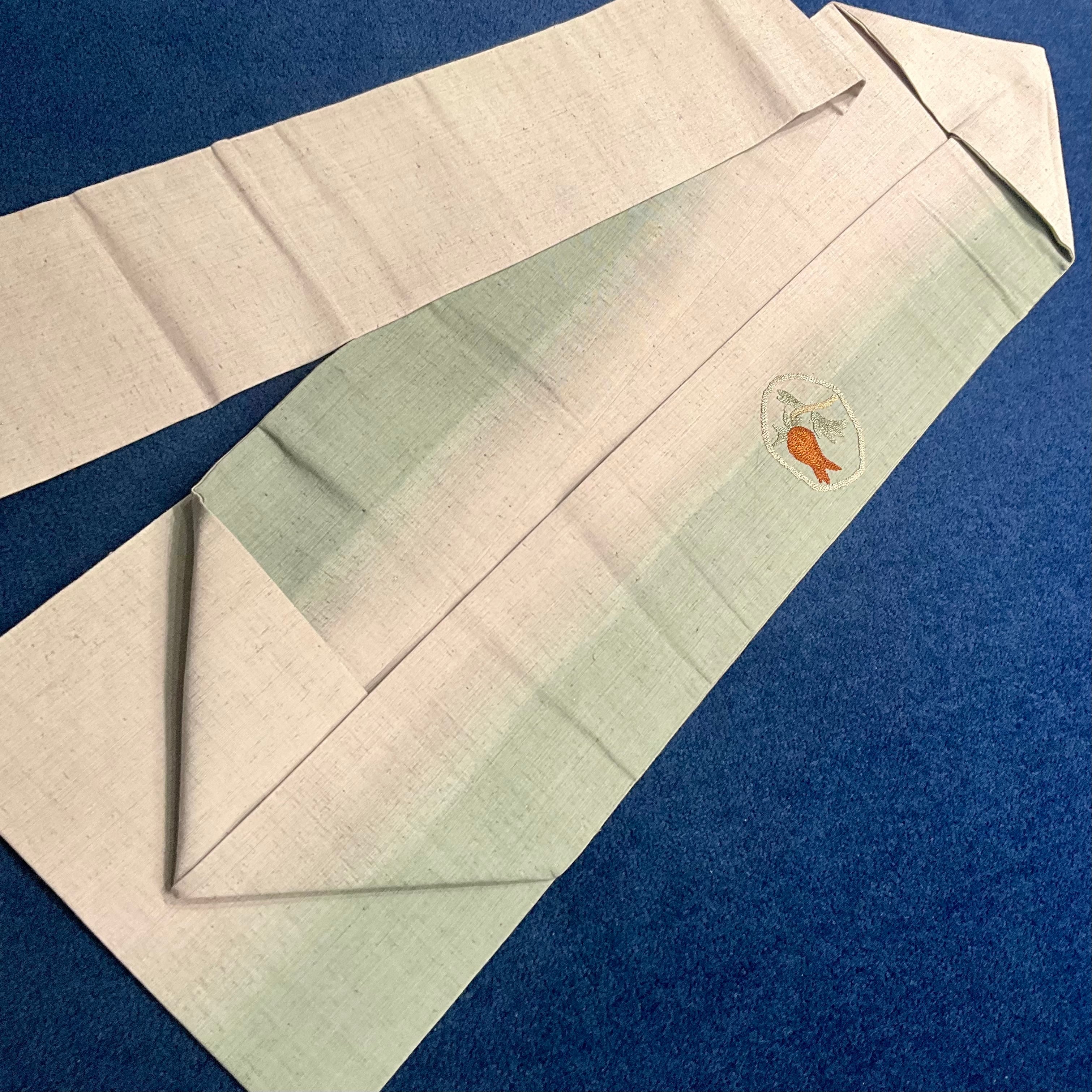 モスグレイ×グリーンの地色に、花模様が相良刺繍で施された名古屋帯です